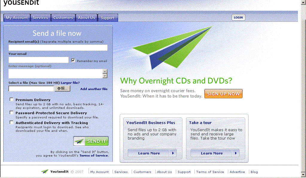 Yousenditは大容量のファイル転送ができます。 メールの添付ファイルでは送れない 大容量のファイルもこれを使えば簡単に送れます。 ファイルサイズは最大100MB無料です。 無料版ファイル配信機能