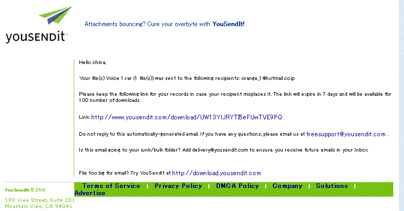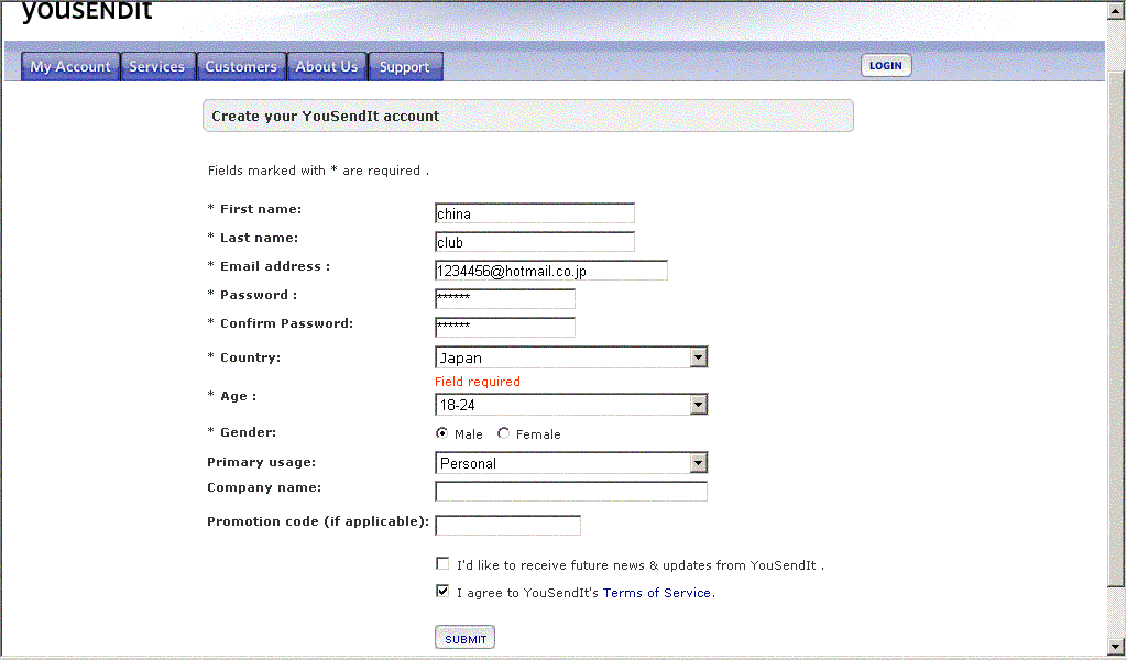 「宅ふぁいる便」より使いやすいです。(個人的に) yousendit登録サイトです。 写真をクリックすると見やすい大きさになります。 ![]() ここではSine UP Nowを選択します。 ![]() ここではLiteFree Sign UPを選択します。 ![]() ここでは上から一行目と二行目の項目は名前を入力します。 次はご自身のメールアドレスを入れます。あとパスワードと順次入力していきます。 一番したのチェックは同意します。にチェック入れます。忘れ無い様に。 このあと先ほど登録したメールアドレスにメールが届きます。 ![]() こんなメールが届きます。そのメールの真中付近にLink http://****とURLが 書いてますのでそこをクリックしてください。 ![]() ここでは先ほど登録したパスワードを入れてLOG INをクリックしてください。