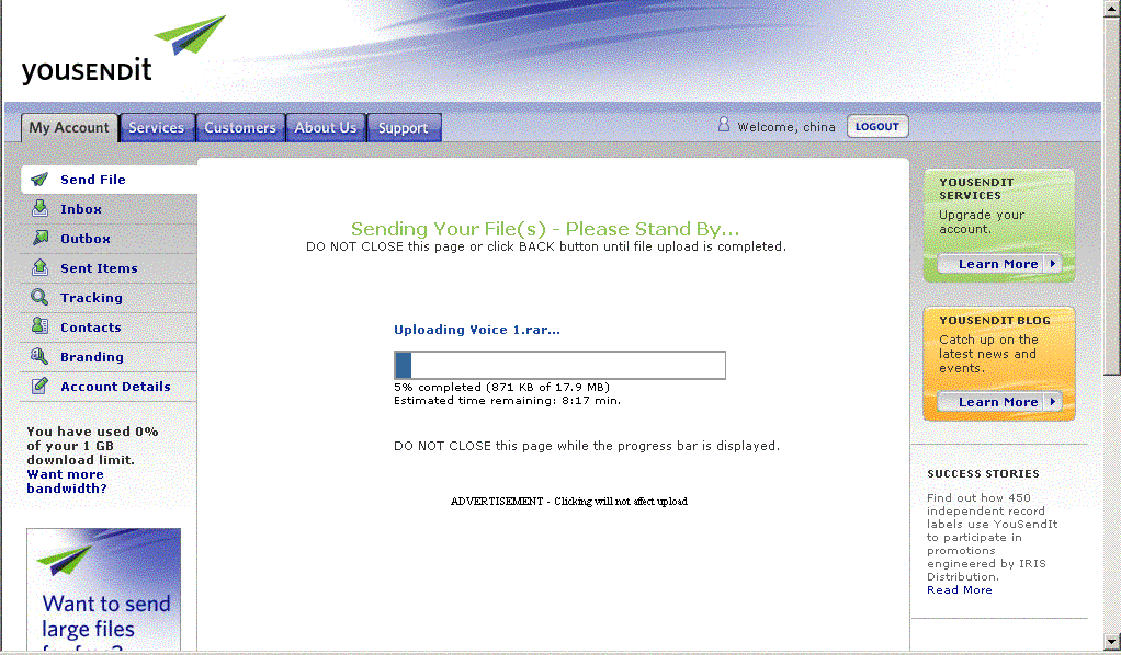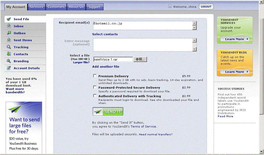 ![]() 一番上のところにはファイルを送りたい相手のメールアドレスを入れます。 次は参照をクリックして送りたいファイルをPCより選択します。 次にSEND ITをクリックして送信します。 ![]() ここはファイルをサーバーにアップしている写真です。 この画面になればOKです。成功 良かったね。ご苦労様 |